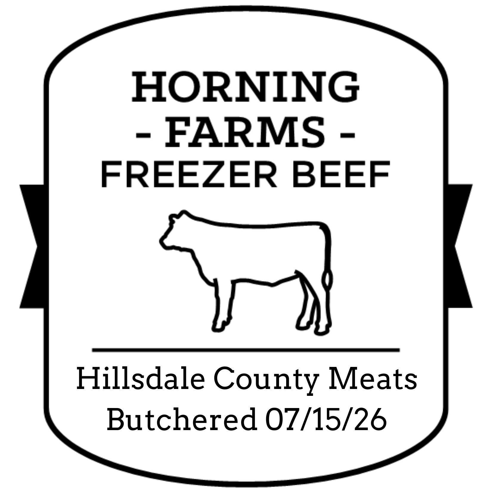 Freezer beef will be charged $3.50 per pound of hanging weight by Horning Farms. Butcher fees are set by and charged by the processor. They are an additional approximate $1 per pound of hanging weight. Hanging weights can vary; we are averaging 850 pounds for a whole beef.